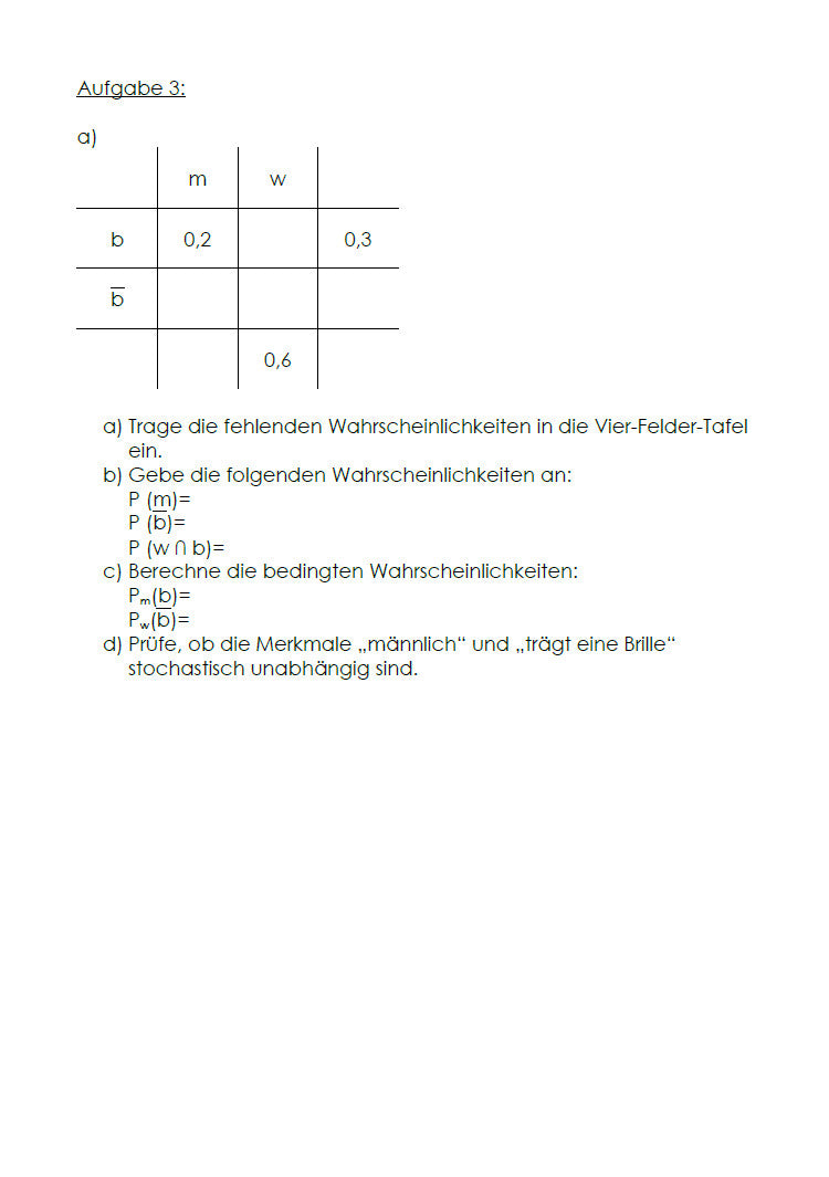 - Stochastische Unabhängigkeit (am Baumdiagramm und an der 4-Felder-Tafel)